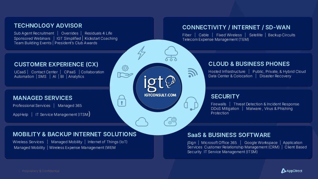 Technology Advisor PortalSee below for the latest updates to give IGT Technology Advisors the resources they need for success. Technology Advisor Forms "Click Here" for Customer Quote Form "Click Here" for Advisor Referral Form "Click Here" for Customer Referral Form Download Wheel of Opportunities CARRIER PRESENTATIONSClick the links below to view our preferred provider presentations. COMCAST LUMEN VERIZON NET2PHONE GOTO J Sign Data Sheet 15 Second Script ← Get a Wholesale Quote!